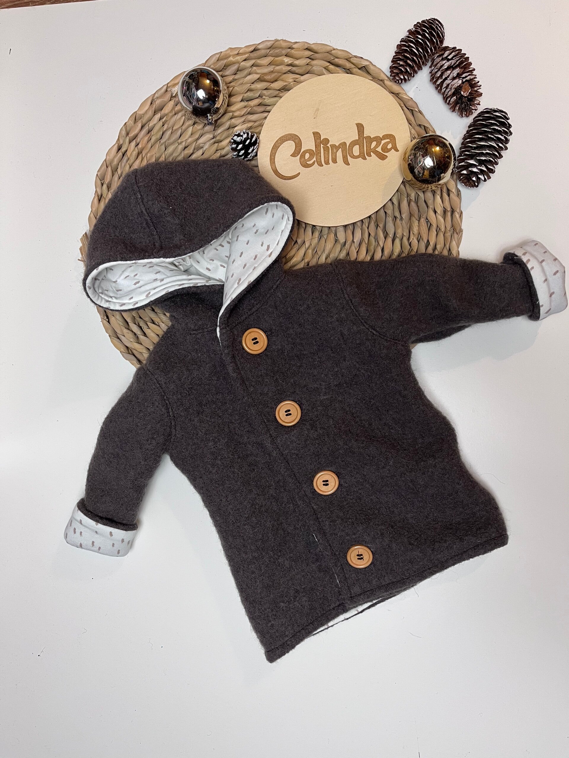schlichte Walkjacke mit Innenfutter und Stickerei am Rücken. Sie wird mit Holzknöpfen verschlossen und hat gekrempelte Ärmel, die lange mitwachsen können.