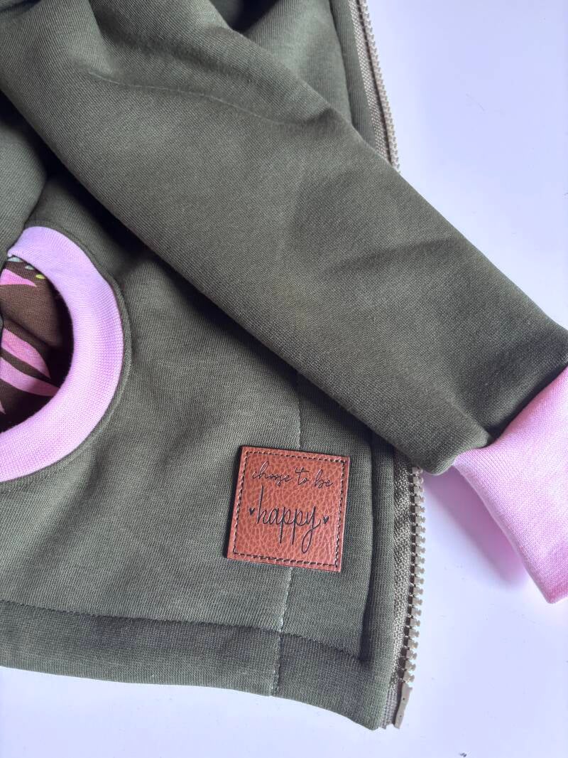 Die Jacke ist ohne zusätzliches Innenfutter genäht, da der Sweat eine weiche Fleeceabseite hat. Das Motiv am Rücken ist mit der Stickmaschine appliziert.